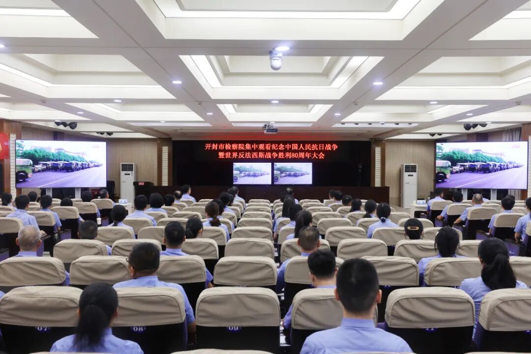 9月3日,河南省开封市检察院干警观看纪念中国人民抗日战争暨世界反法西斯战争胜利80周年大会。